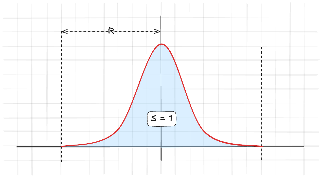 - Быть нормированной: интеграл по всему пространству должен быть равен 1. Это нужно чтобы увеличение радиуса сглаживания не влияло на вычисляемое значение.